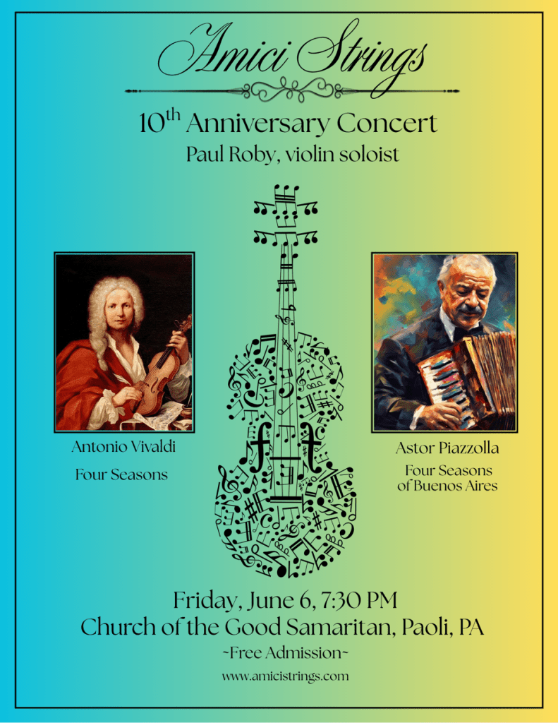 Looking for a fun music-filled evening? Come experience Amici Strings on June 6, 2025 as we return to our roots and present the Four Seasons for our 10th Anniversary concert.